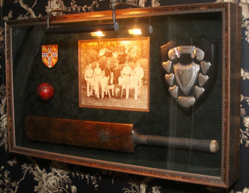 Photograph of Queen Victoria's Cricket Team complete with trophy shield, badge, bat and ball