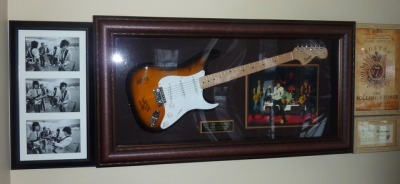 FENDER GUITAR SIGNED BY MICK, KEITH, RON AND CHARLIE OF THE ROLLING STONES - Original triptych by Henry Dilz 1978 and 1979 Paris Concert Tickets.